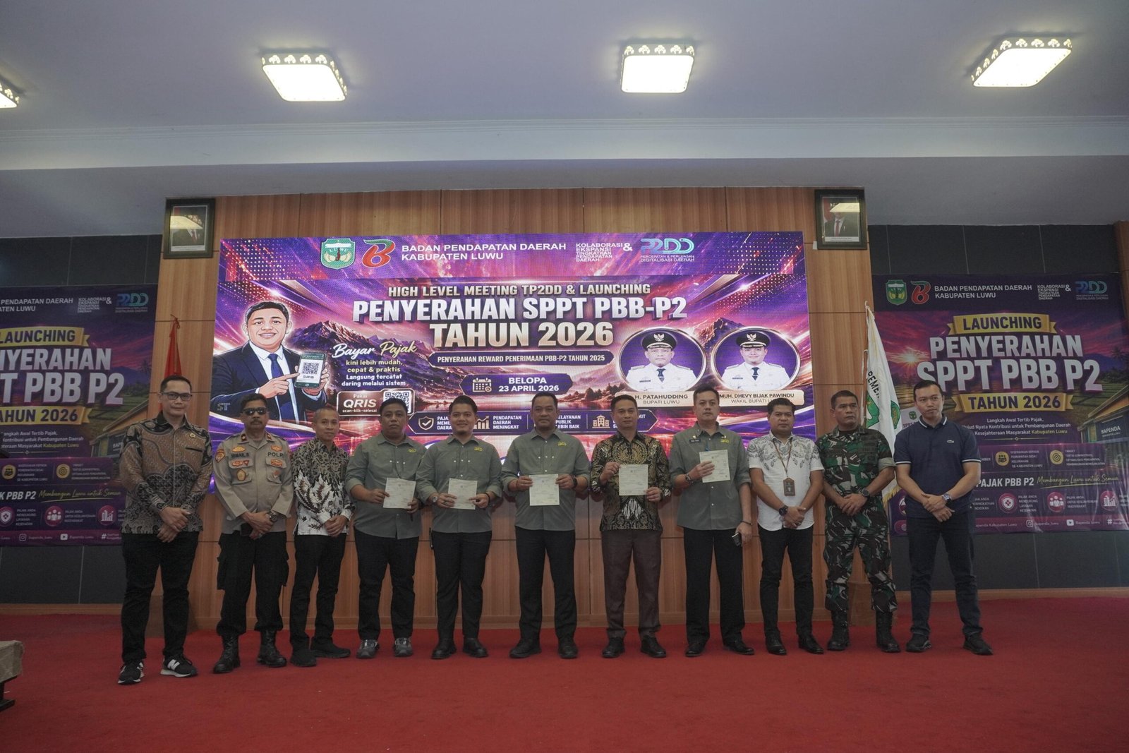 Kabarpublic.com – Bupati Luwu, Patahudding, menghadiri High Level Meeting Tim Percepatan dan Perluasan Digitalisasi Daerah (TP2DD) yang dirangkaikan dengan launching penyerahan SPPT PBB-P2 Tahun 2026 serta penyerahan reward penerimaan PBB-P2, Kamis (23/4/2026), di Aula Andi Kambo, Kompleks Perkantoran Bupati Luwu.