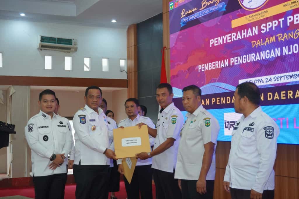 Kabarpublic.com – Bupati Luwu, Patahudding, menyerahkan Surat Pemberitahuan Pajak Terutang (SPPT) Pajak Bumi dan Bangunan Perdesaan dan Perkotaan (PBB-P2) revisi hasil pengurangan Nilai Jual Objek Pajak (NJOP) tahun 2025, sekaligus menghapuskan denda sanksi administrasi PBB-P2.