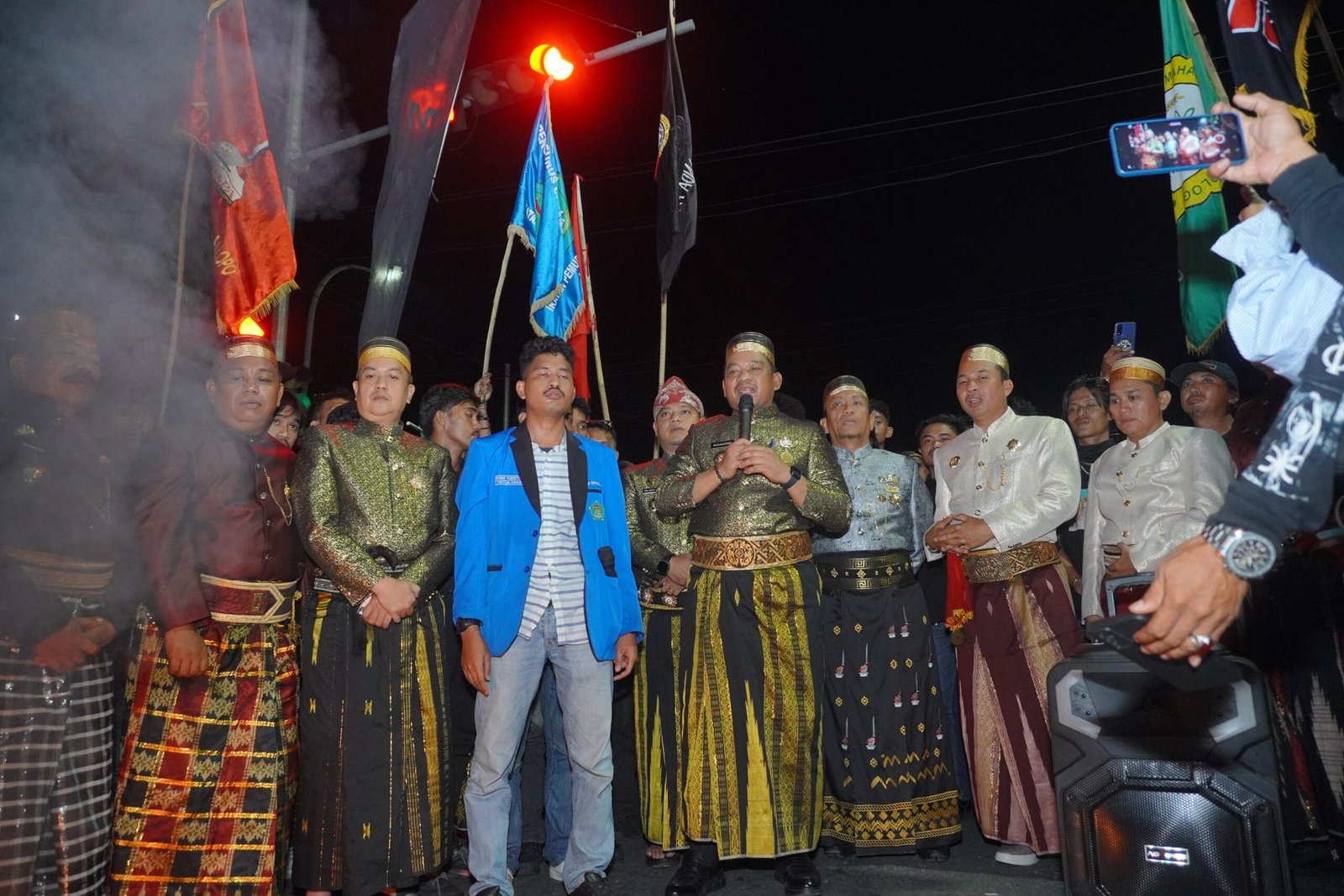 Patahudding didampingi Ketua DPRD Kabupaten Luwu serta para kepala daerah se-Tana Luwu menghampiri massa aksi usai menghadiri acara puncak Peringatan Hari Jadi Luwu ke-758 dan Hari Perlawanan Rakyat Luwu (HPRL) ke-80 yang digelar di Istana Kedatuan Luwu.
