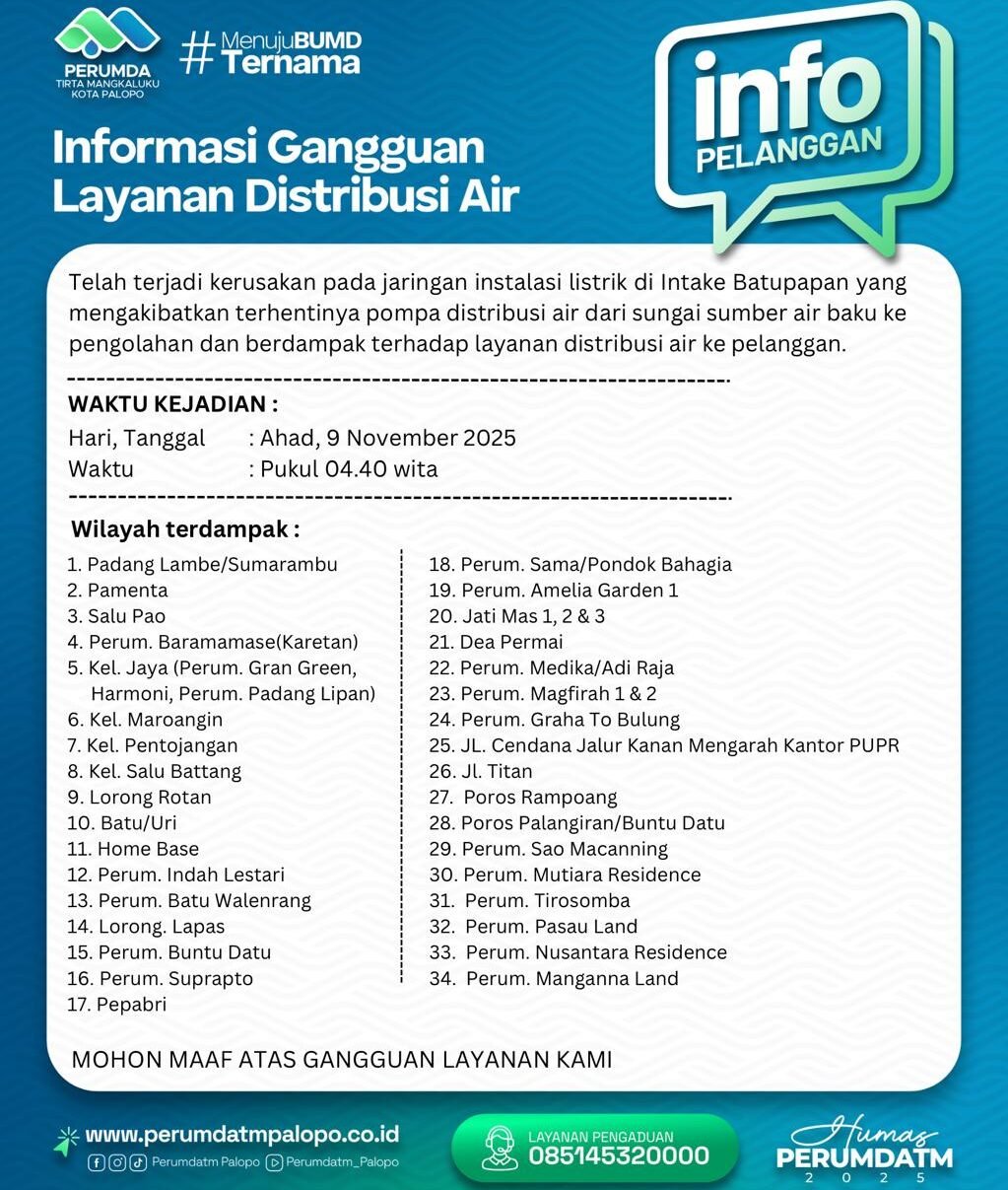 Kabarpublic.com – Perusahaan Umum Daerah (Perumda) Tirta Mangkaluku (TM) Kota Palopo mengumumkan adanya gangguan distribusi air bersih di sejumlah wilayah akibat kerusakan pada jaringan instalasi listrik di Intake Batupapan, Ahad (9/11/2025).
