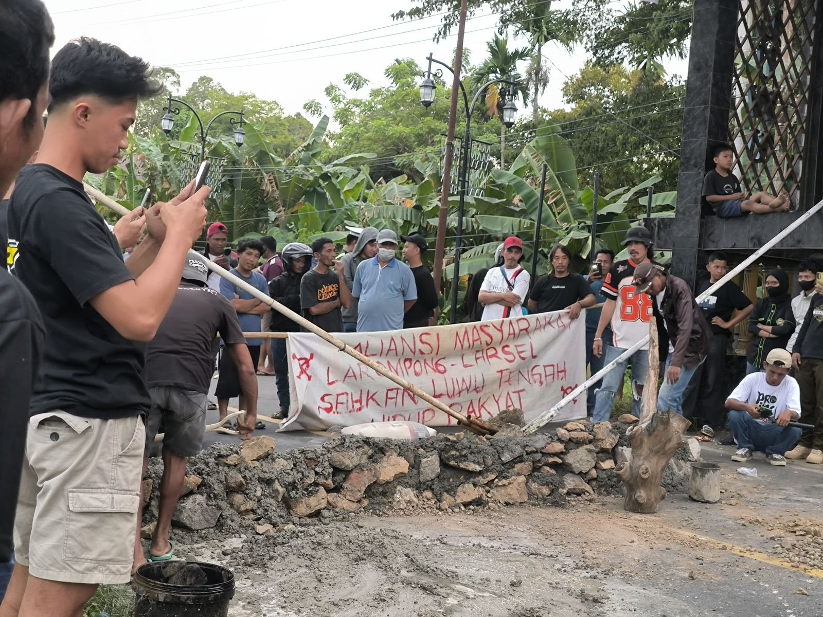 Aksi kemudian memuncak ketika massa, dibantu ibu-ibu dan warga setempat, secara simbolik menutup dan memutus akses Jalan Poros Trans Sulawesi di perbatasan Wajo–Luwu dengan mendirikan pondasi batu melintang di badan jalan.