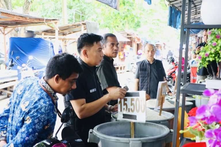 Petugas turun langsung memeriksa stok dan harga jual beras, serta berdialog dengan pedagang untuk menilai kondisi pasar terkini.