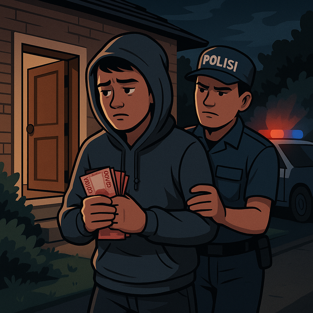 RB ditangkap tanpa perlawanan saat bersembunyi di rumah pamannya. Kepada penyidik, ia mengakui telah mengambil uang milik korban ketika rumah dalam keadaan kosong.