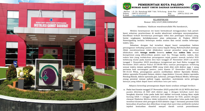 Klarifikasi tersebut dituangkan dalam surat bernomor 007/2427/RSUDSWG/PLP tertanggal 15 Desember 2025.