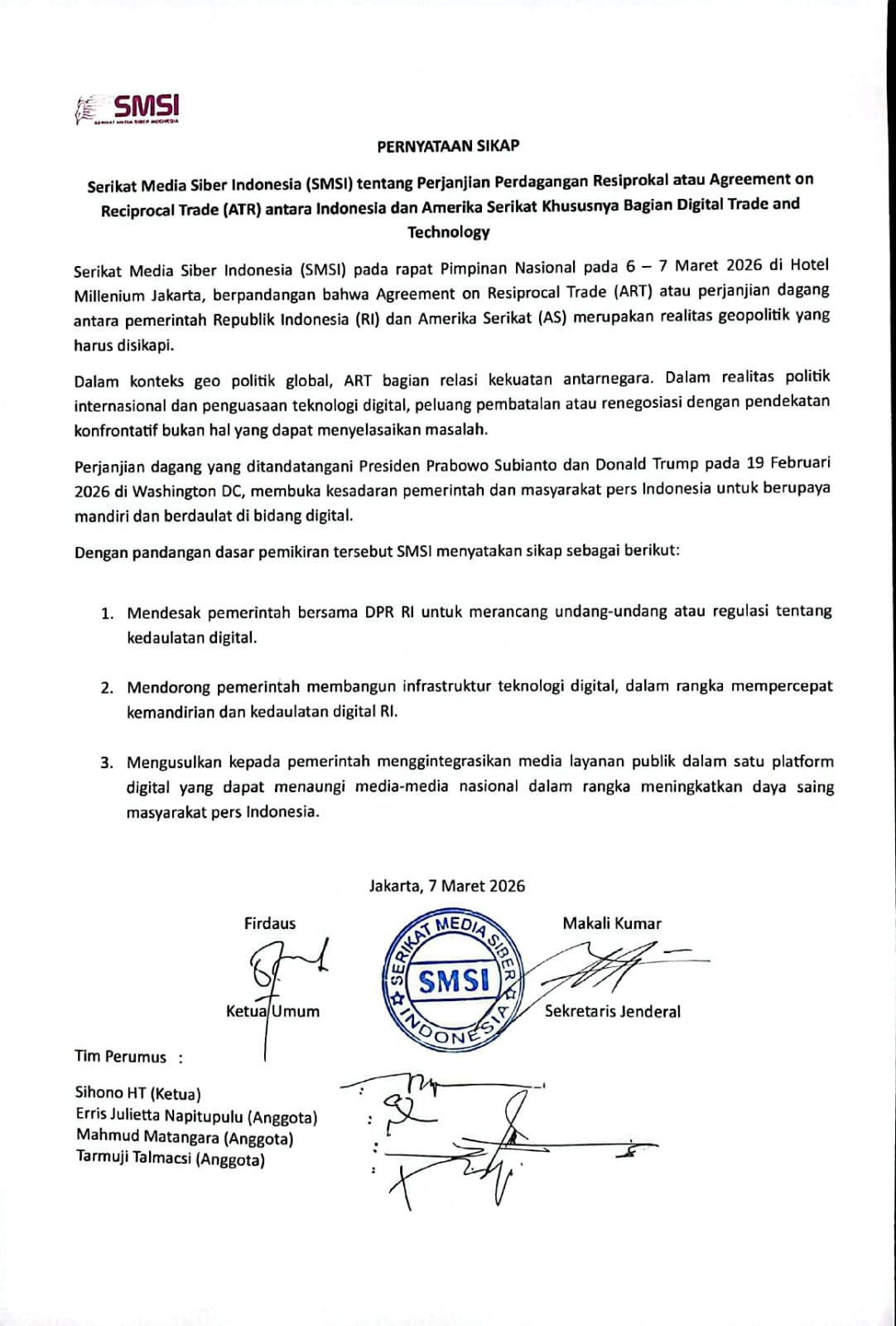 Dalam forum tersebut, SMSI menyampaikan pernyataan sikap terkait dampak perdagangan digital terhadap masa depan ekosistem media nasional.