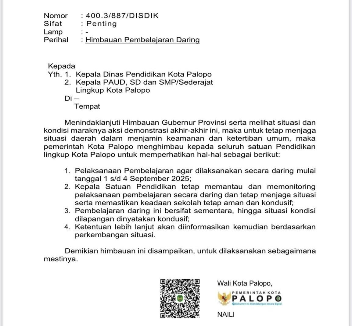 Melalui surat bernomor 400.3/887/DISDIK, Wali Kota Palopo menginstruksikan seluruh satuan pendidikan, mulai dari PAUD, SD, hingga SMP/sederajat, untuk melaksanakan pembelajaran secara daring pada 1–4 September 2025.