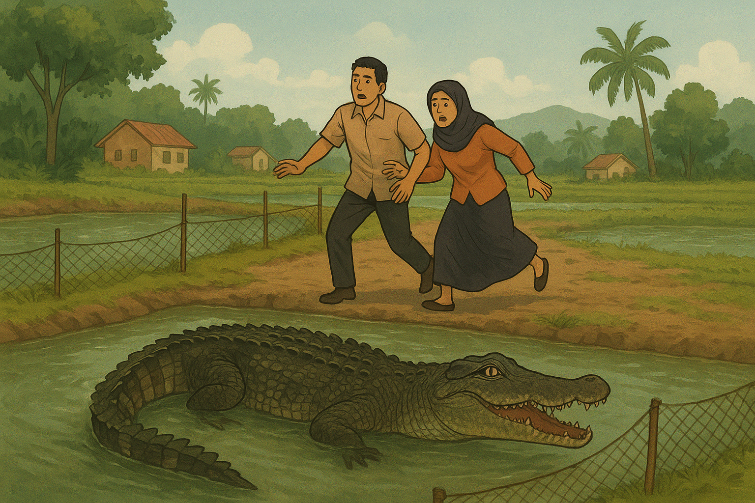 Namun peristiwa mengejutkan terjadi saat proses pencarian berlangsung. Dua anggota keluarga korban tiba-tiba diserang seekor buaya di dalam empang.